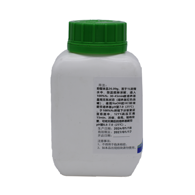 稱取本品26.0g,置于1L蒸餾水中,微溫?cái)嚢枞芙?,通?/span>100%N2 30-45min使培養(yǎng)基呈現(xiàn)無氧狀態(tài)(培養(yǎng)基紅色消褪),使用NaOH或HCl溶液調(diào)節(jié)培養(yǎng)基pH至7.0(25℃),于100%N2環(huán)境下分裝至適宜容器中,121℃高壓滅菌15min,冷卻,備用。如有需要,可將滅菌后的培養(yǎng)基調(diào)節(jié)pH至6.8-7.0(25℃)。