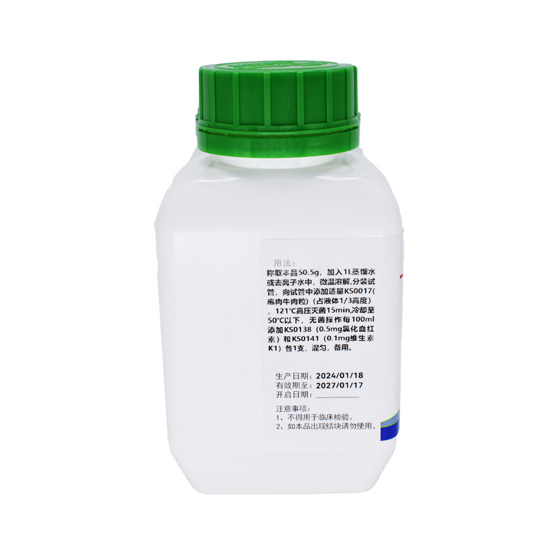 稱取本品50.5g,加入1L蒸餾水中或去離子水中,微溫溶解,分裝試管,向試管中添加適量KS0017(庖肉牛肉粒)(占液體1/3高度),121℃高壓滅菌15min,冷卻至50℃以下,無(wú)菌操作每100ml添加KS0138(0.5mg氯化血紅素)和KS0141(0.1mg維生素K1)各1支,混勻,備用。